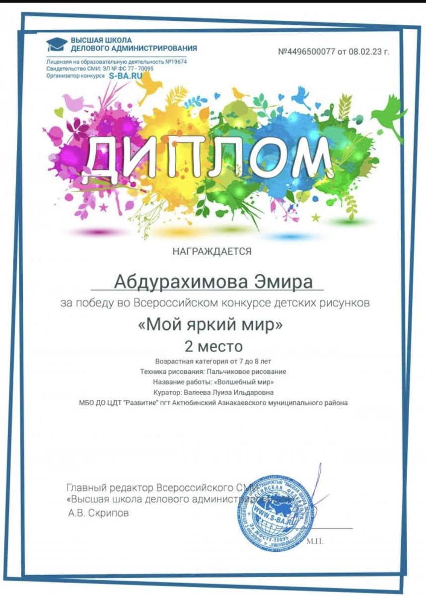 Диплом за 2 место в конкурсе "Мой яркий мир", участница Абдурахимова Э., педагог Валеева Л.И.