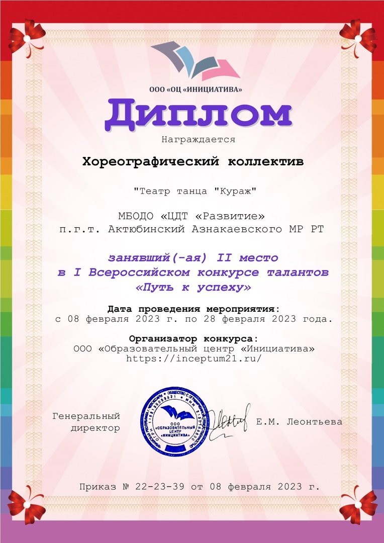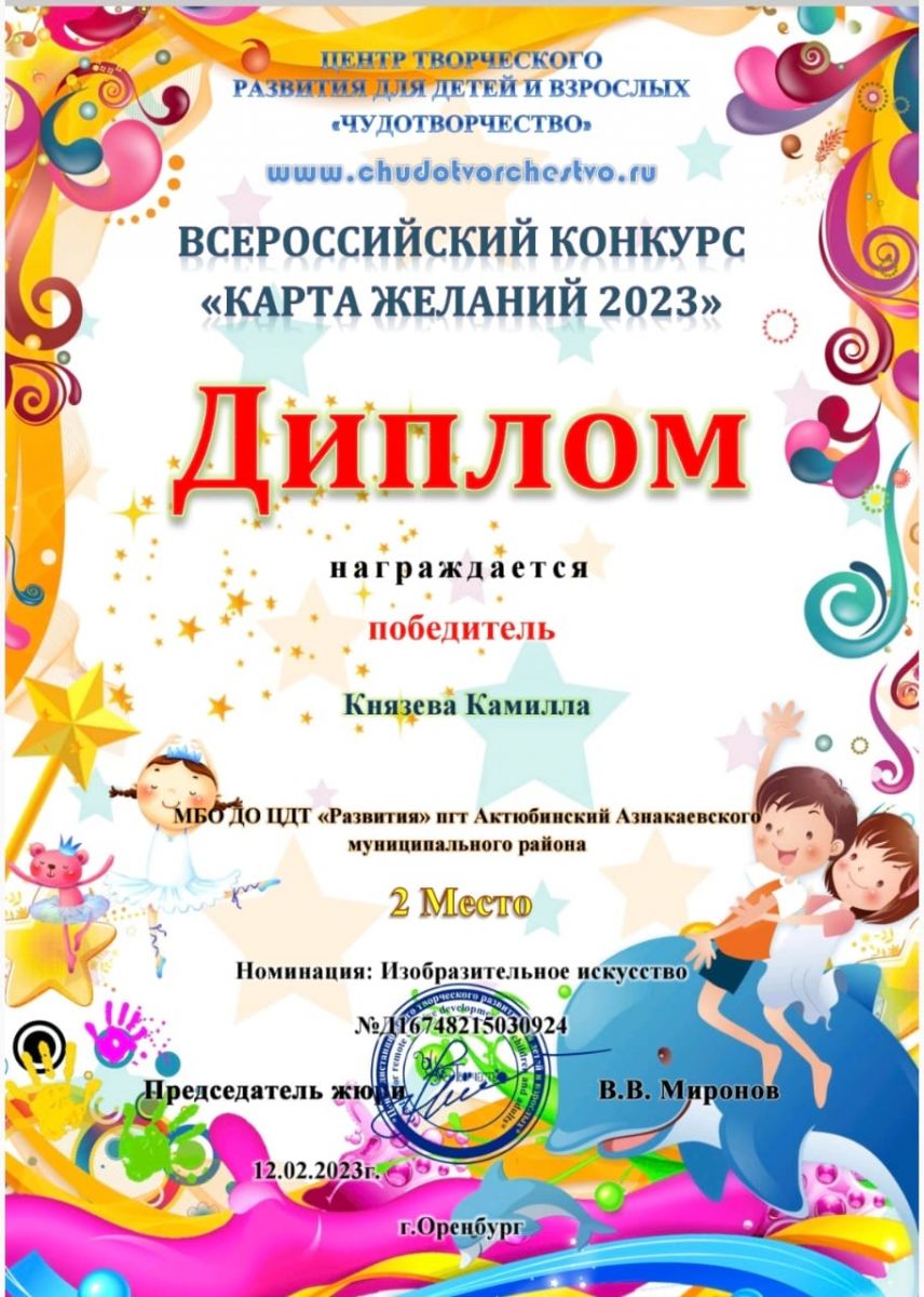 Диплом за 2 место в конкурсе "Карта желаний 2023", участница Князева К., педагог Валеева Л.И.