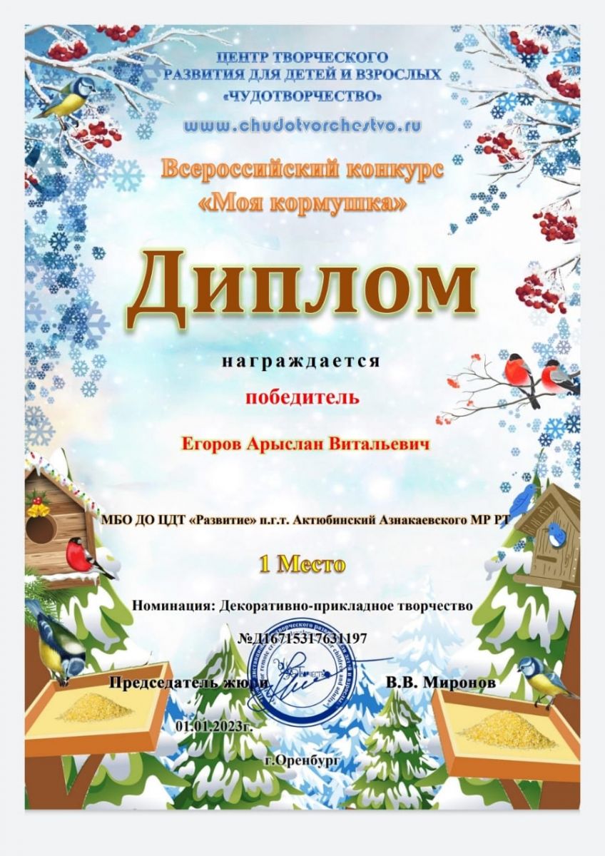Диплом за 1 место в конкурсе "Моя кормушка", участник Егоров А., педагог Кашапова Ф.И.