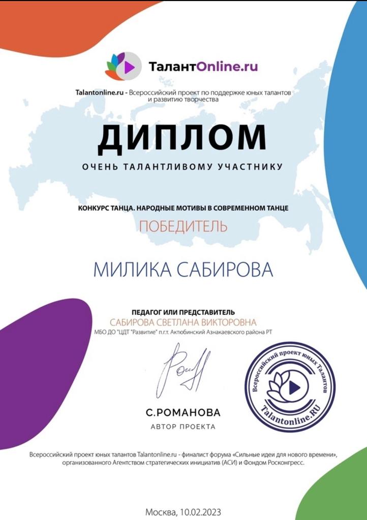 Диплом за 1 место в конкурсе "Широкая масленица", участница Галиуллина А., педагог Шарипова Г.Ш.