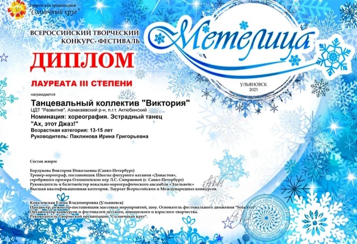 Диплом за 1 место в конкурсе "Зима в окно стучится", участница Жильцова В., педагог Мамбетова С.И.