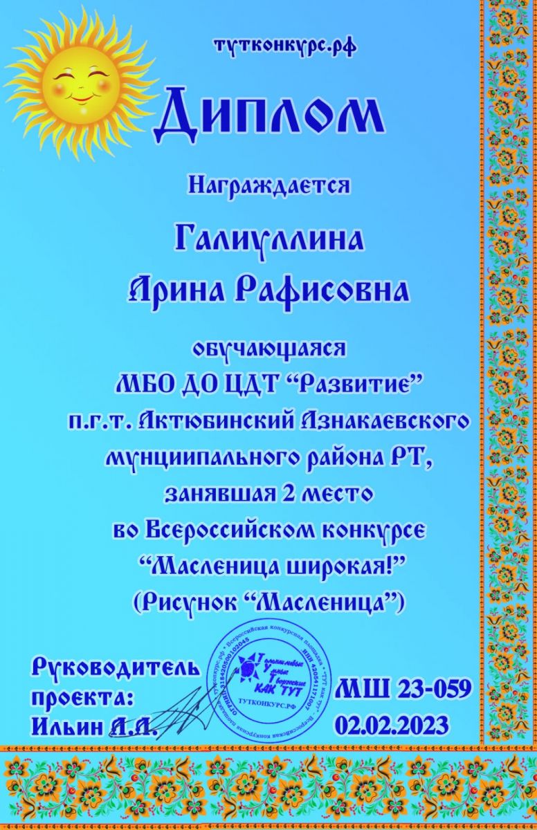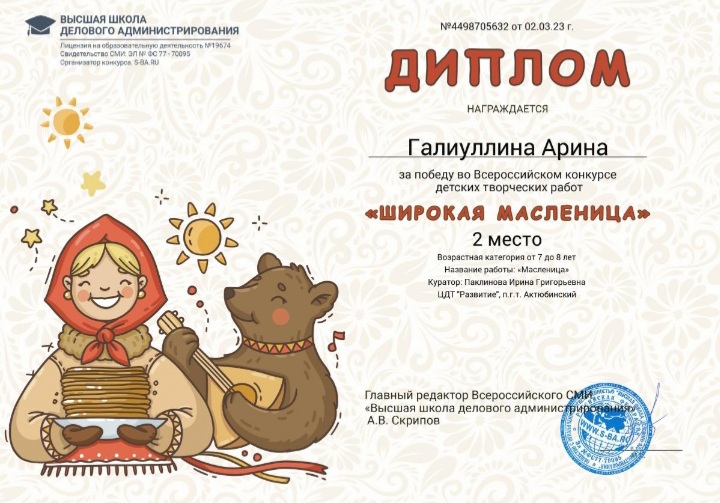Диплом за 2 место в конкурсе "Масленницаширокая", участница Галиуллина А., педагог Паклинова И.Г.