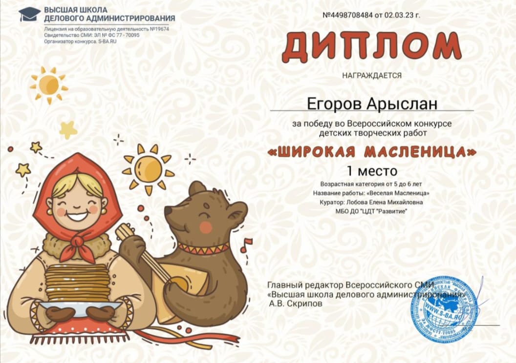 Диплом за 1 место в конкурсе "Широкая масленица",участник Егоров А., педагог Лобова Е.М.