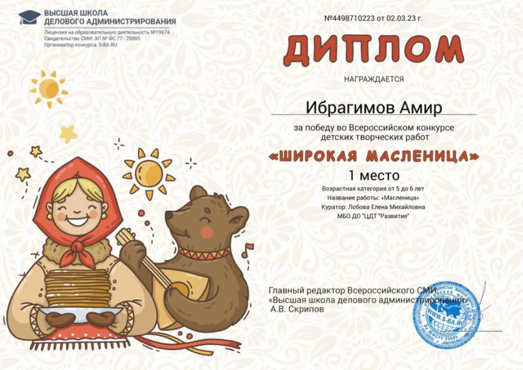 Диплом за 1 место в конкурсе "Широкая масленица",участник Ибрагимов А., педагог Лобова Е.М.