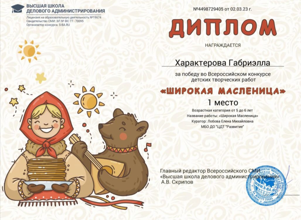 Диплом за 1 место в конкурсе "Широкая масленица",участница Характерова Г., педагог Лобова Е.М.