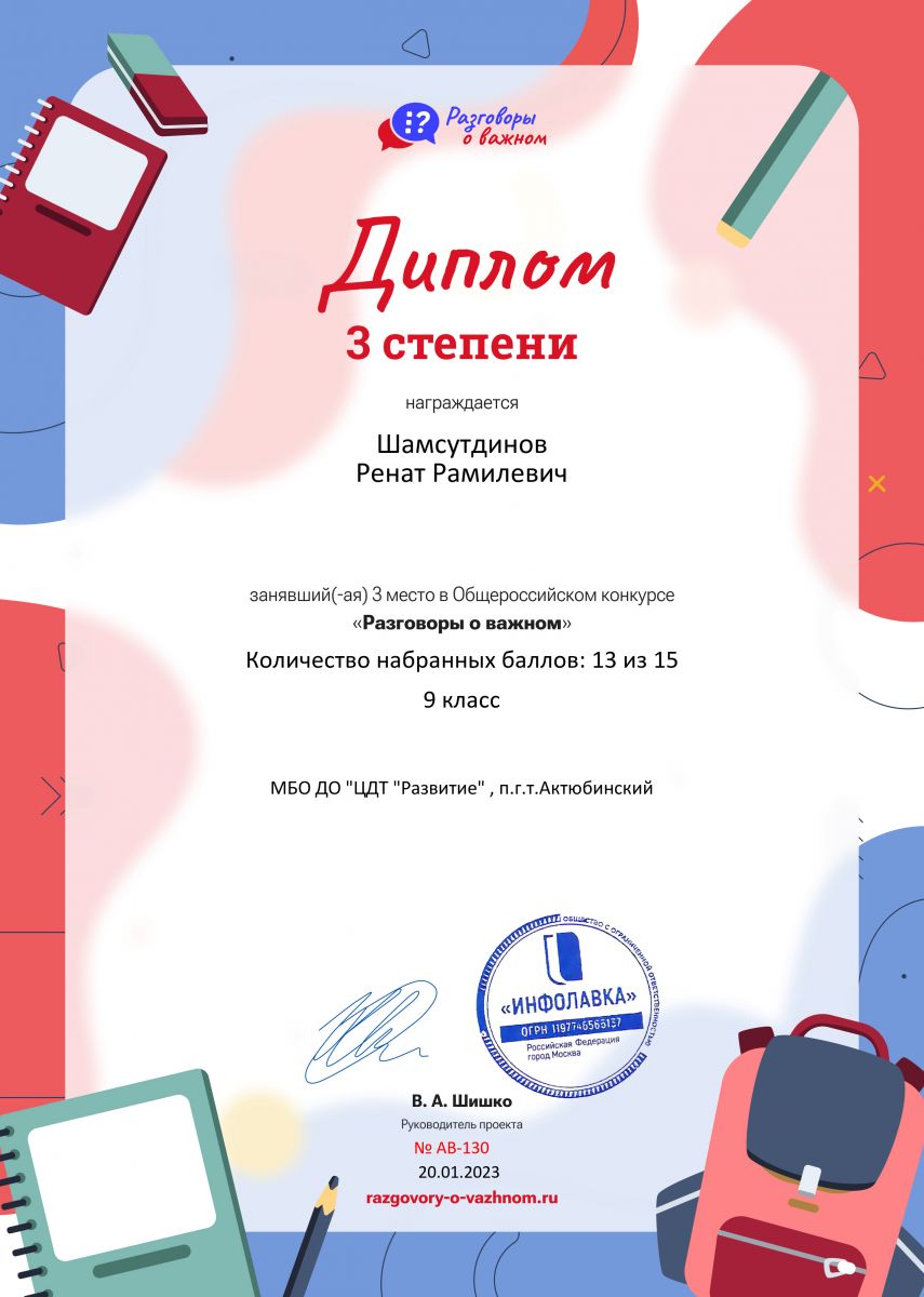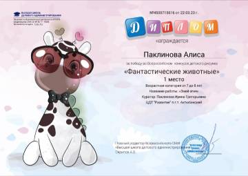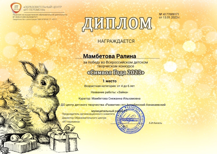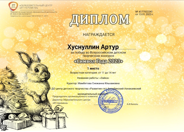 Диплом за 1 место в конкурсе "Символ года 2023", участник Хуснуллин А., педагог Мамбетова С.И.