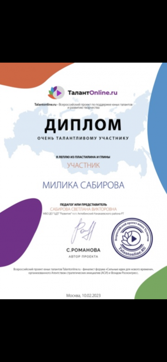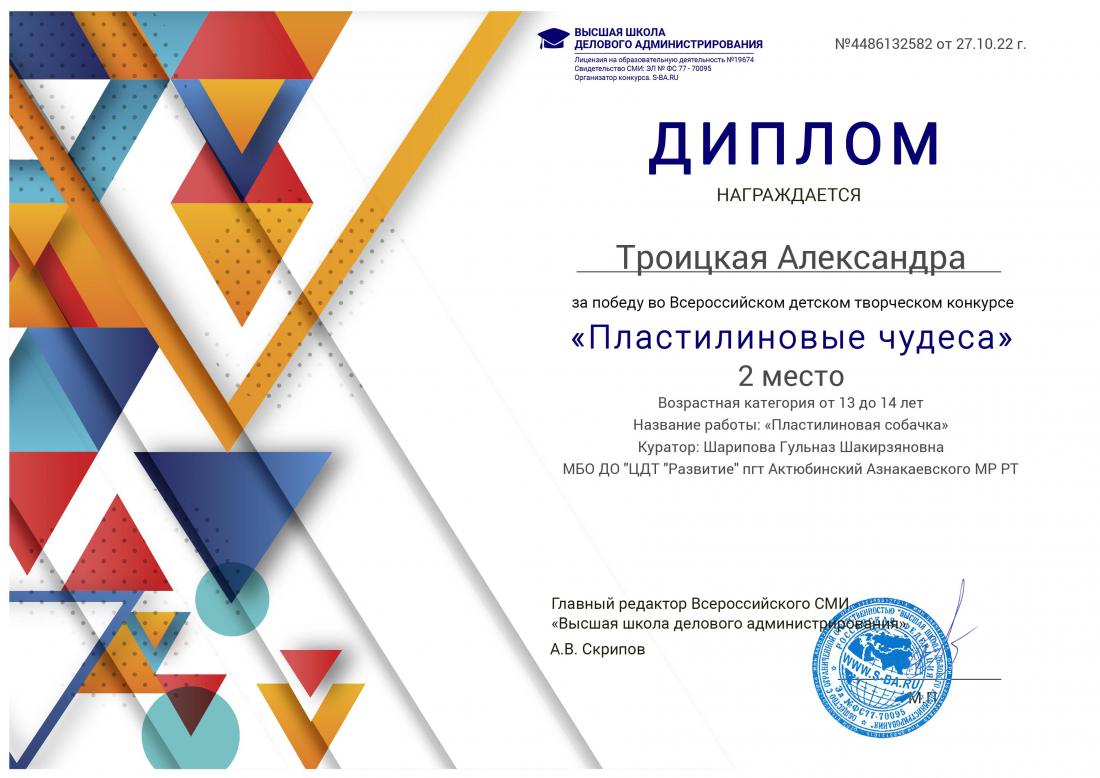 Диплом за 2 место в конкурсе "Пластилиновые чудеса", участница Троицкая А., педагог Шарипова Г.Ш.