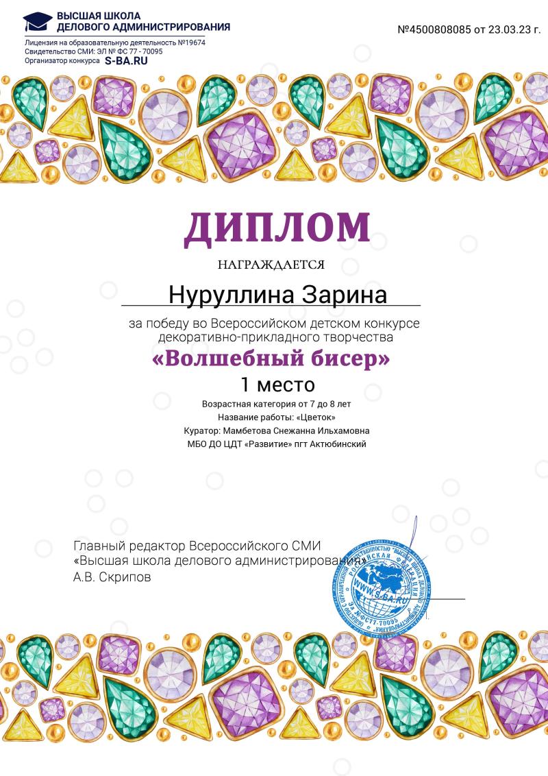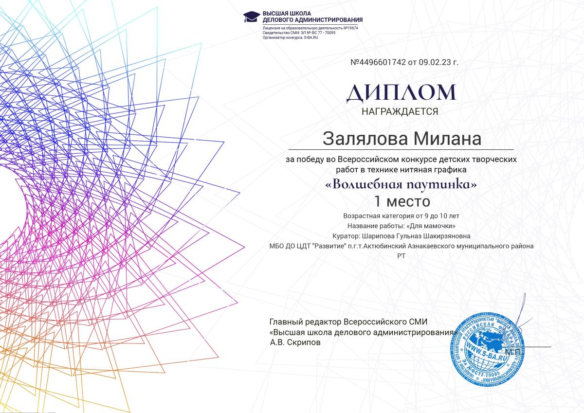 Диплом за 1 место в конкурсе "Волшебная паутинка", участница Залялова М., педагог Шарипова Г.Ш.