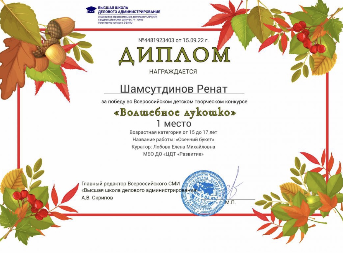 Диплом за 1 место в конкурсе "Волшебное лукошко",участник Шамсутдинов Р., педагог Лобова Е.М.