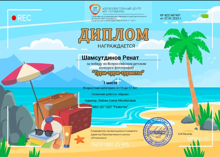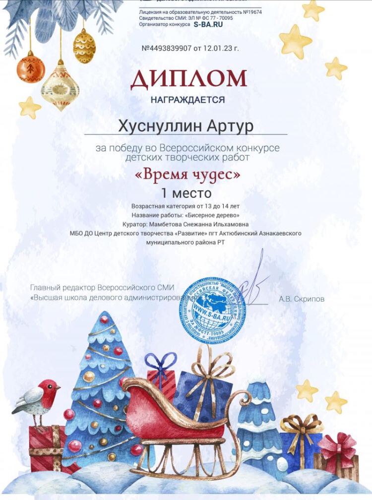 Диплом за 1 место в конкурсе "Время чудес", участник Хуснуллин А., педагог Мамбетова С.И.