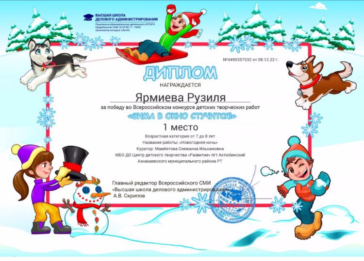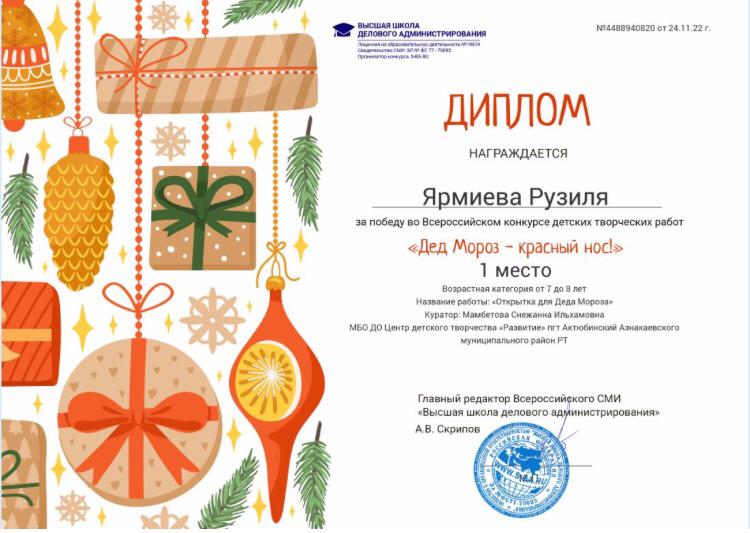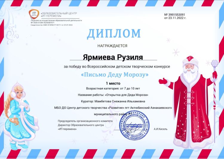 Диплом за 1 место в конкурсе "Письмо Деду Морозу", участница Ярмиева Р., педагог Мамбетова С.И.