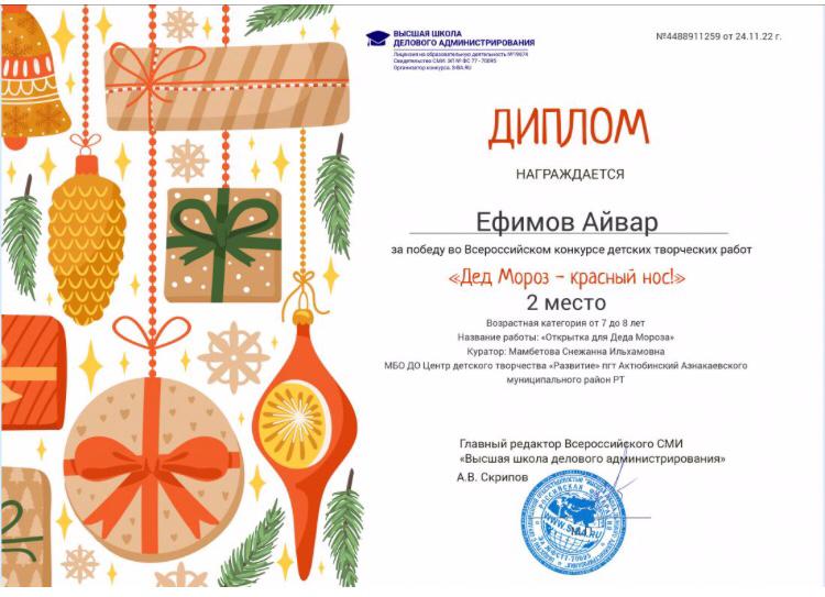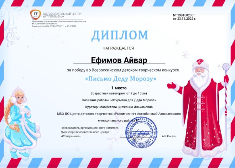 Диплом за 1 место в конкурсе "Письмо Деду Морозу", участник Ефимов А., педагог Мамбетова С.И.