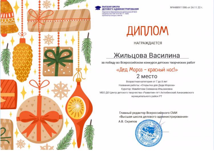 Диплом за 2 место в конкурсе "Письмо Деду Морозу", участница Жильцова В., педагог Мамбетова С.И.