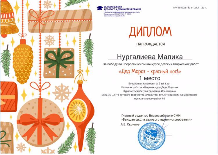 Диплом за 1 место в конкурсе "Письмо Деду Морозу", участница Нургалиева М., педагог Мамбетова С.И.