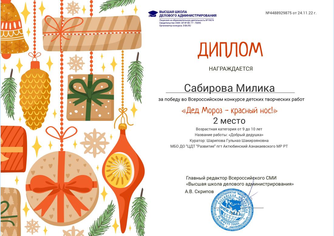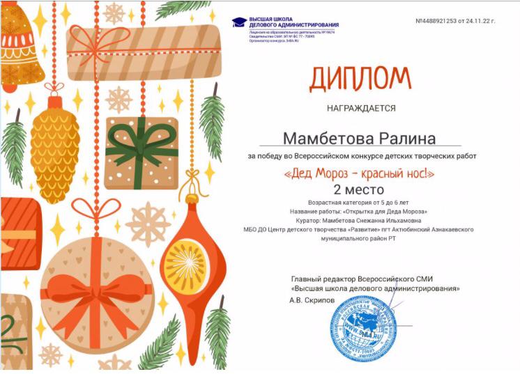 Диплом за 2 место в конкурсе "Дед Мороз - красный нос", участница Ганеева С., педагог Мамбетова С.И.
