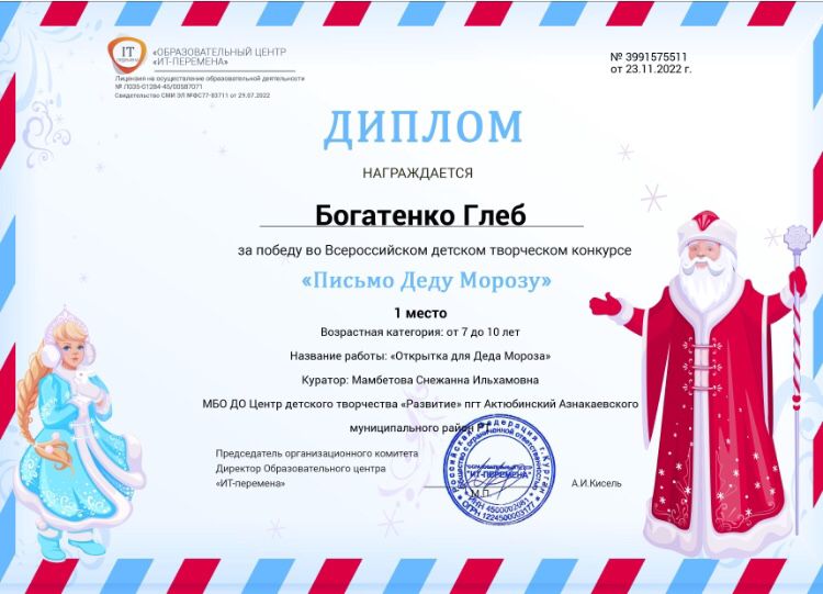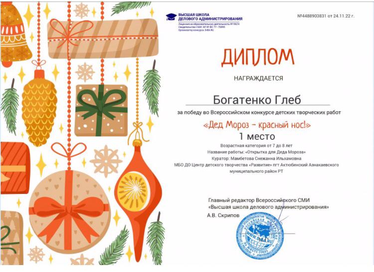 Диплом за 1 место в конкурсе "Письмо Деду Морозу", участник Богатенко Г., педагог Мамбетова С.И.