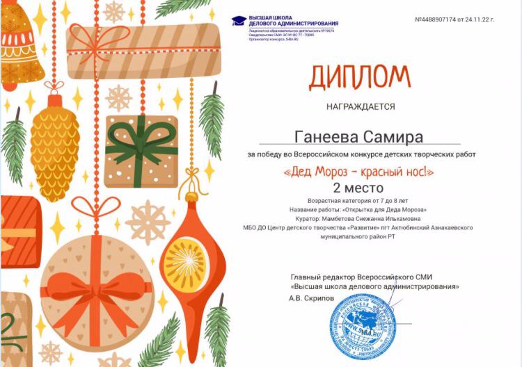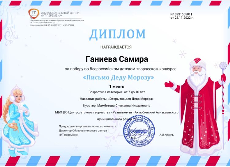 Диплом за 1 место в конкурсе "Письмо Деду Морозу", участница Ганиева С., педагог Мамбетова С.И.