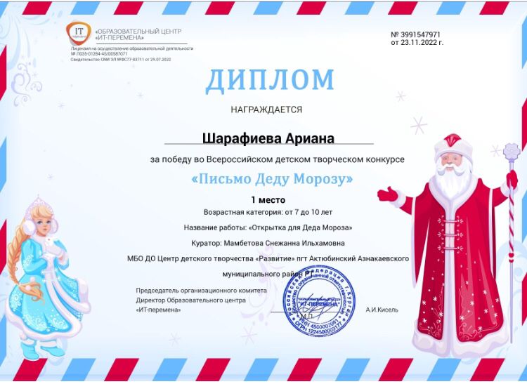 Диплом за 1 место в конкурсе "Письмо Деду Морозу", участница Шарафиева А., педагог Мамбетова С.И.