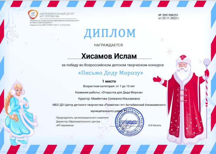 Диплом за 1 место в конкурсе "Письмо Деду Морозу", участник Хисамов И., педагог Мамбетова С.И.
