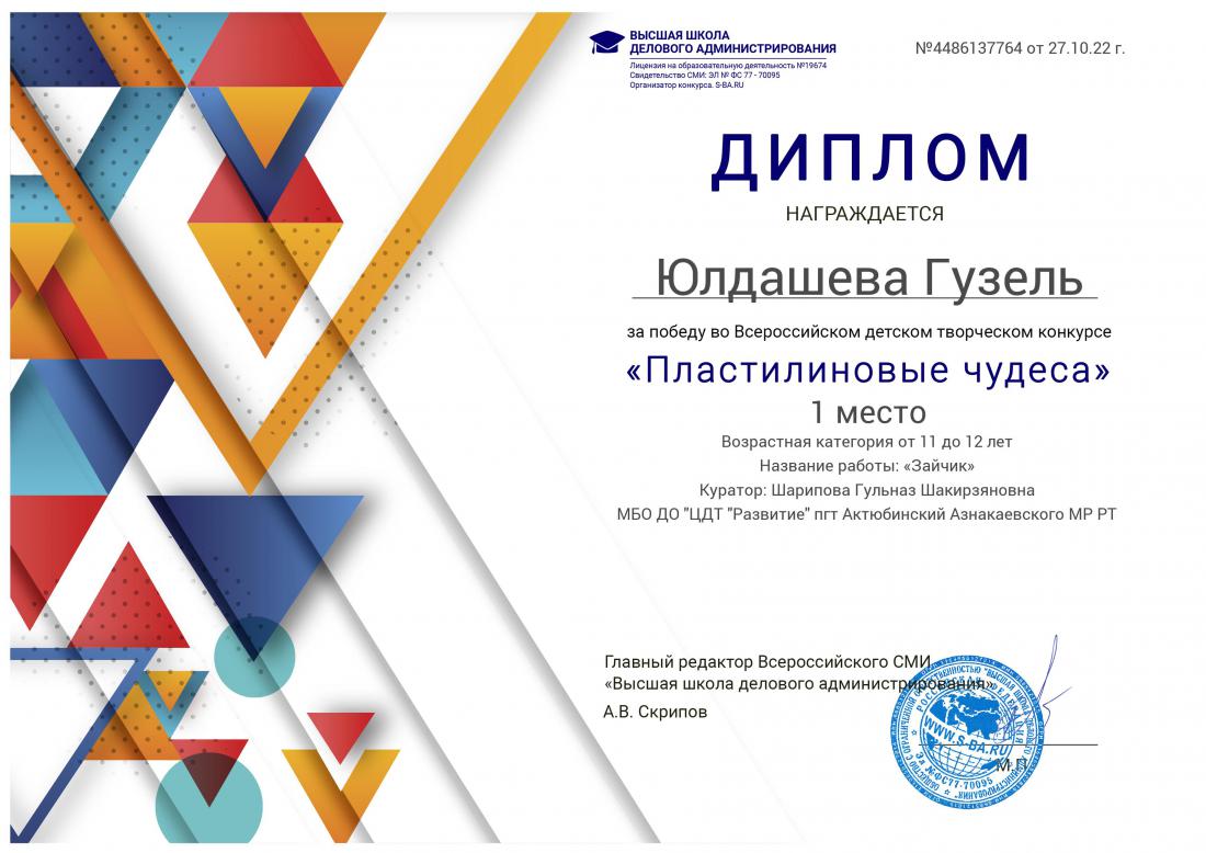 Диплом за 1 место в конкурсе "Пластилиновые чудеса", участница Юлдашева Г., педагог Шарипова Г.Ш.
