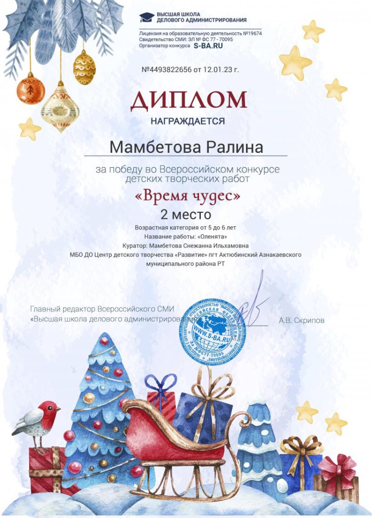Диплом за 2 место в конкурсе "Время чудес", участница Мамбетова Р., педагог Мамбетова С.И.