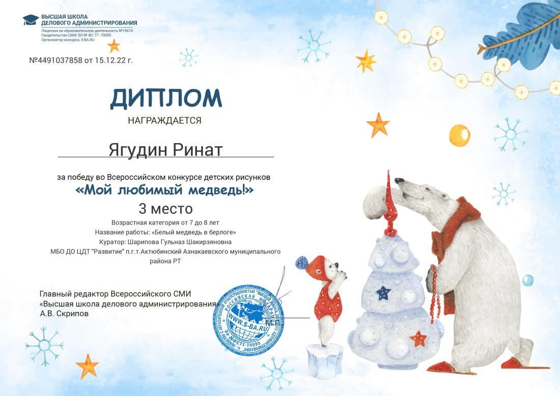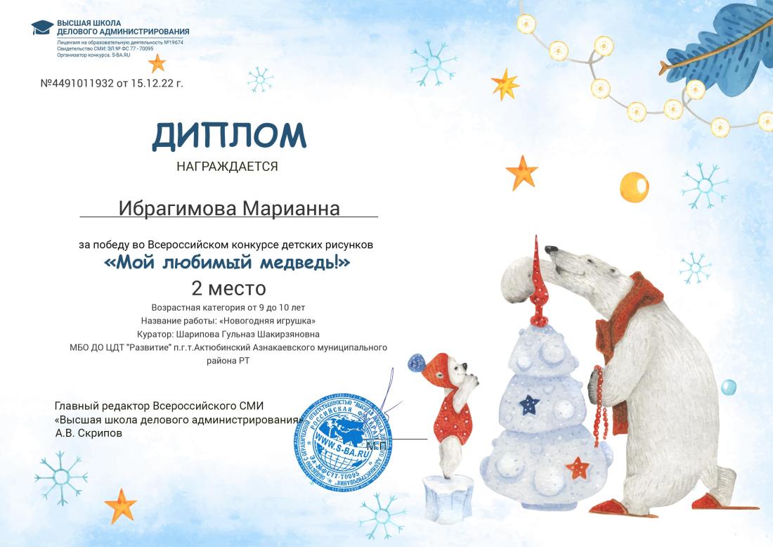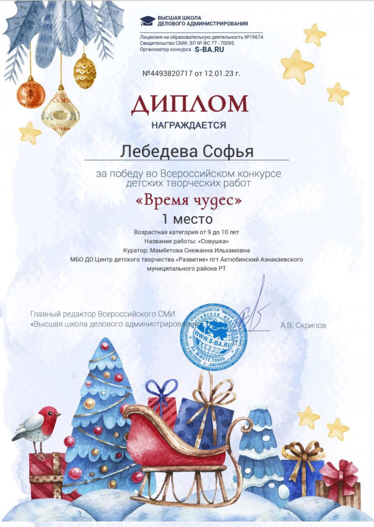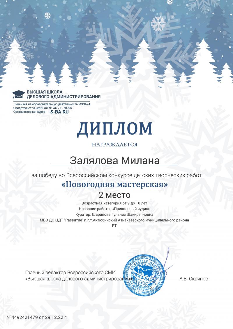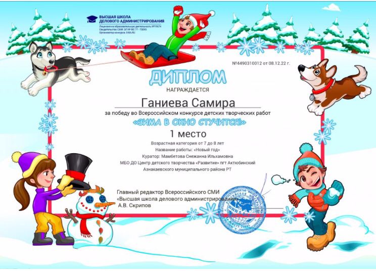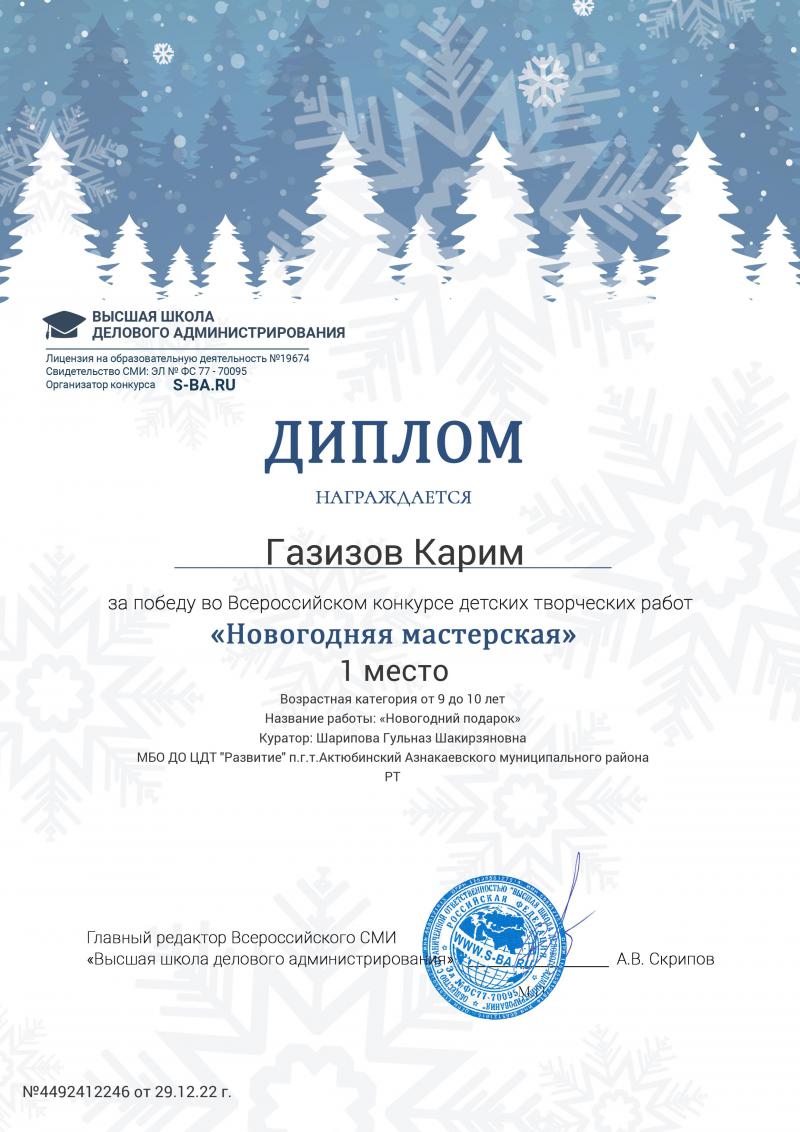 Диплом за 1 место в конкурсе "Новогодняя мастерская", участник Салахов И., педагог Шарипова Г.Ш.