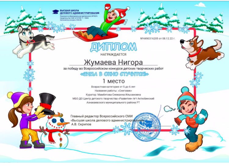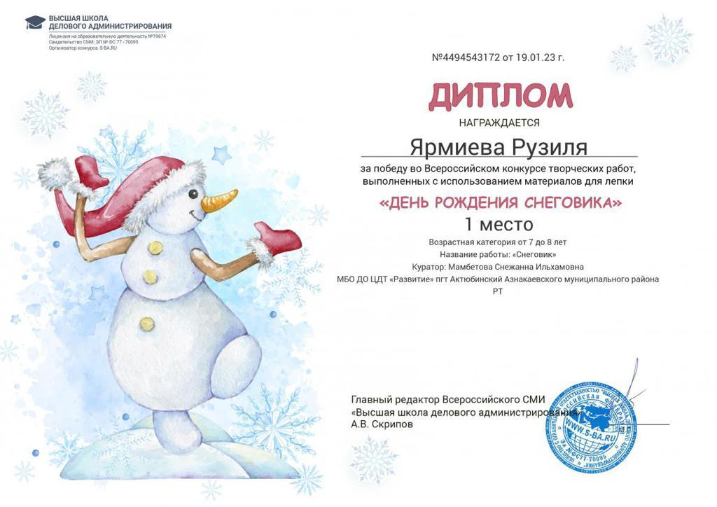 Диплом за 1 место в конкурсе "День рождения Снеговика", участница Ярмиева Р., педагог Мамбетова С.И.