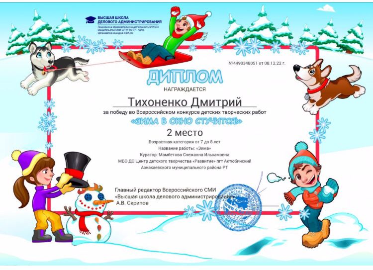 Диплом за 2 место в конкурсе "Зима в окно стучится", участник Тихоненко Д., педагог Мамбетова С.И.