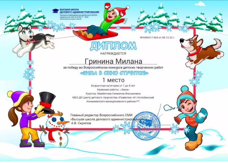 Диплом за 1 место в конкурсе "Зима в окно стучится", участница Гринина М., педагог Мамбетова С.И.