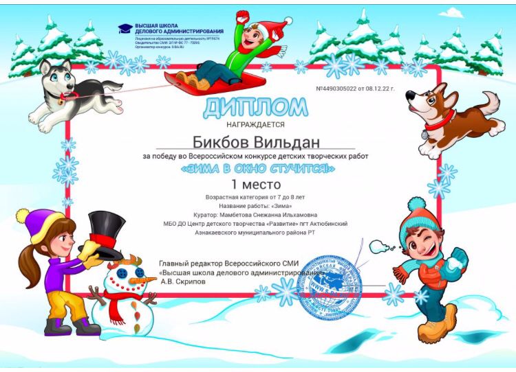 Диплом за 1 место в конкурсе "Зима в окно стучится", участник Калимуллин У., педагог Мамбетова С.И.
