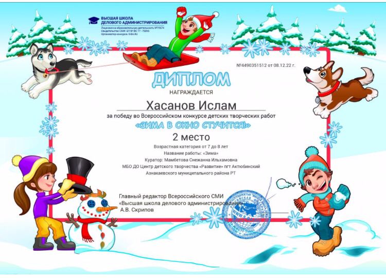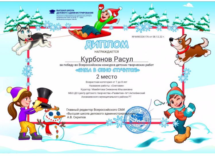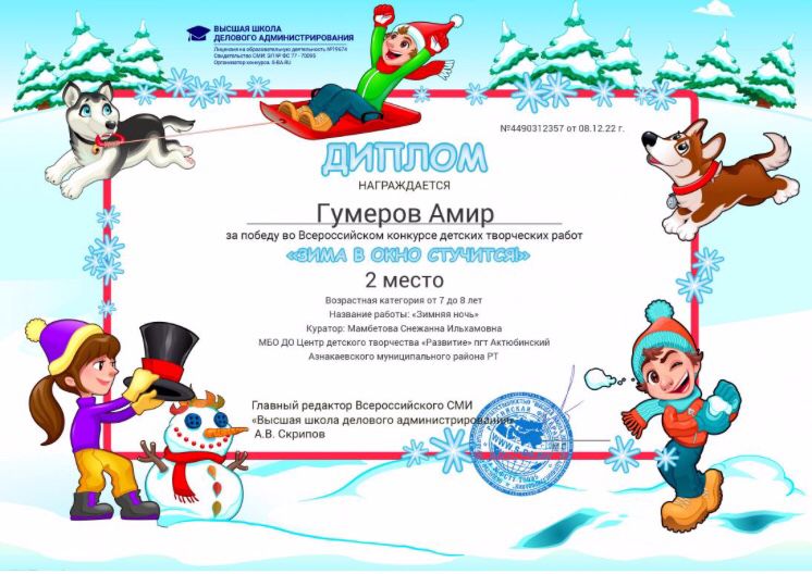 Диплом за 2 место в конкурсе "Зима в окно стучится", участник Гумеров А., педагог Мамбетова С.И.
