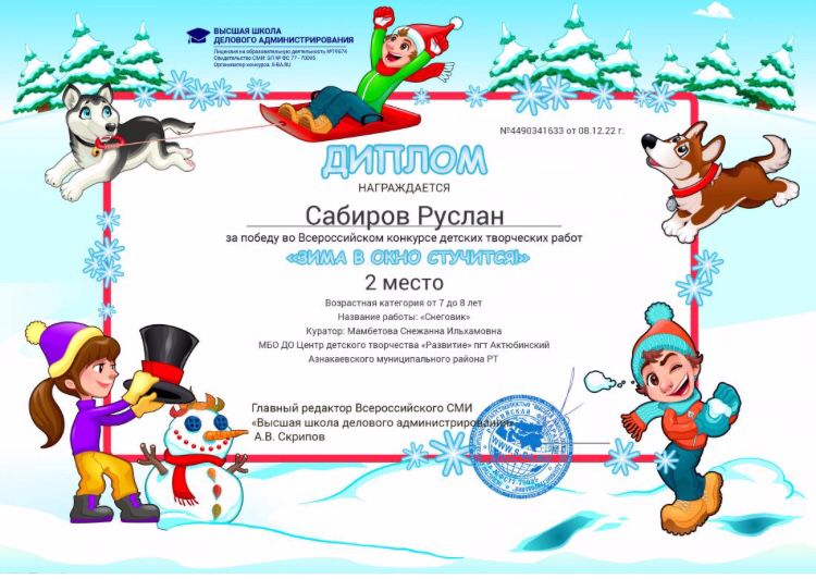 Диплом за 2 место в конкурсе "Зима в окно стучится", участник Сабиров Р., педагог Мамбетова С.И.