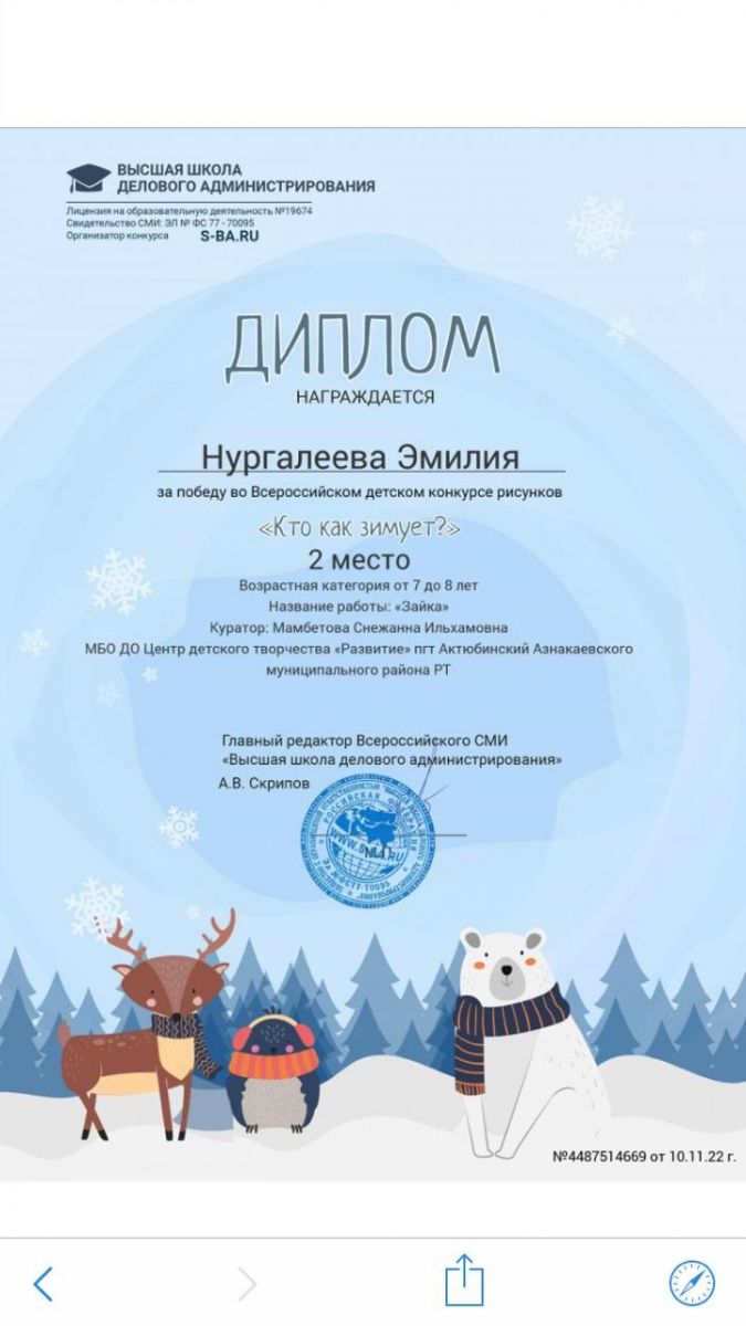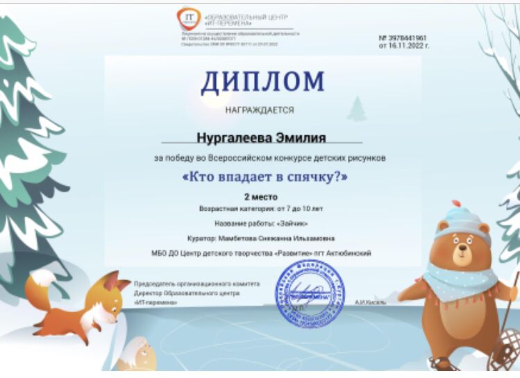 Диплом за 2 место в конкурсе "Кто как зимует", участница Нургалеева Э., педагог Мамбетова С.И.