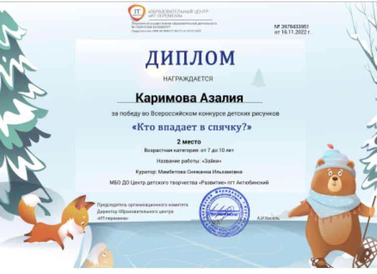 Диплом за 2 место в конкурсе "Зима в окно стучится", участник Муминова И., педагог Мамбетова С.И.