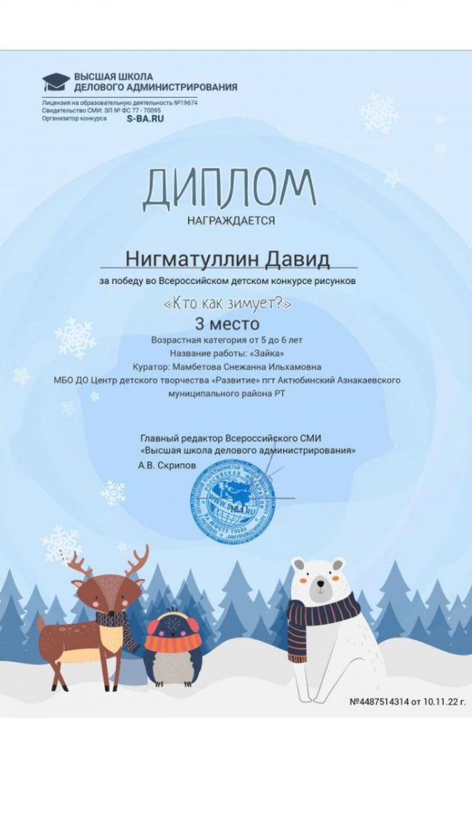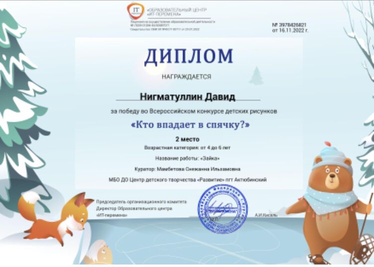 Диплом за 3 место в конкурсе "Кто как зимует", участник Нигматуллин Д., педагог Мамбетова С.И.