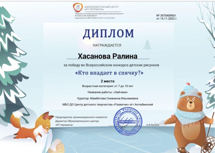 Диплом за 2 место в конкурсе "Кто как зимует", участница Хасанова Р., педагог Мамбетова С.И.