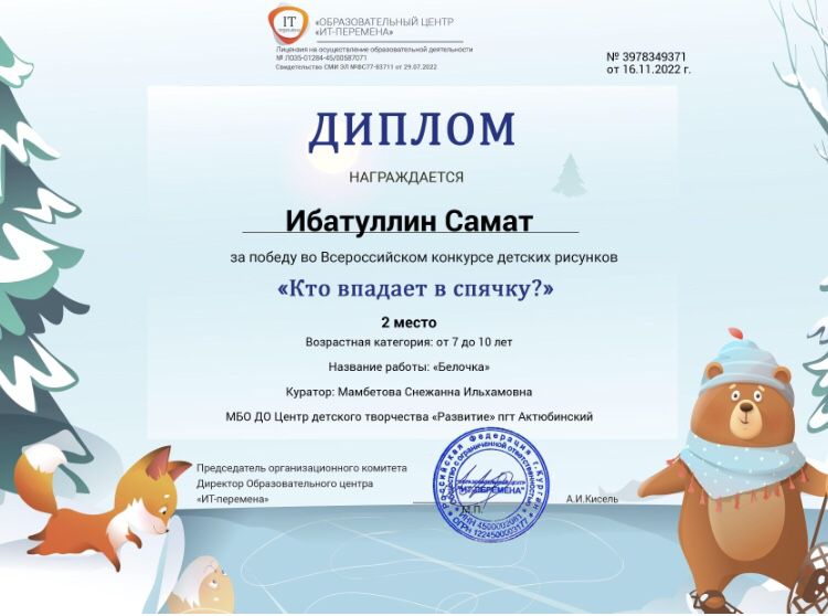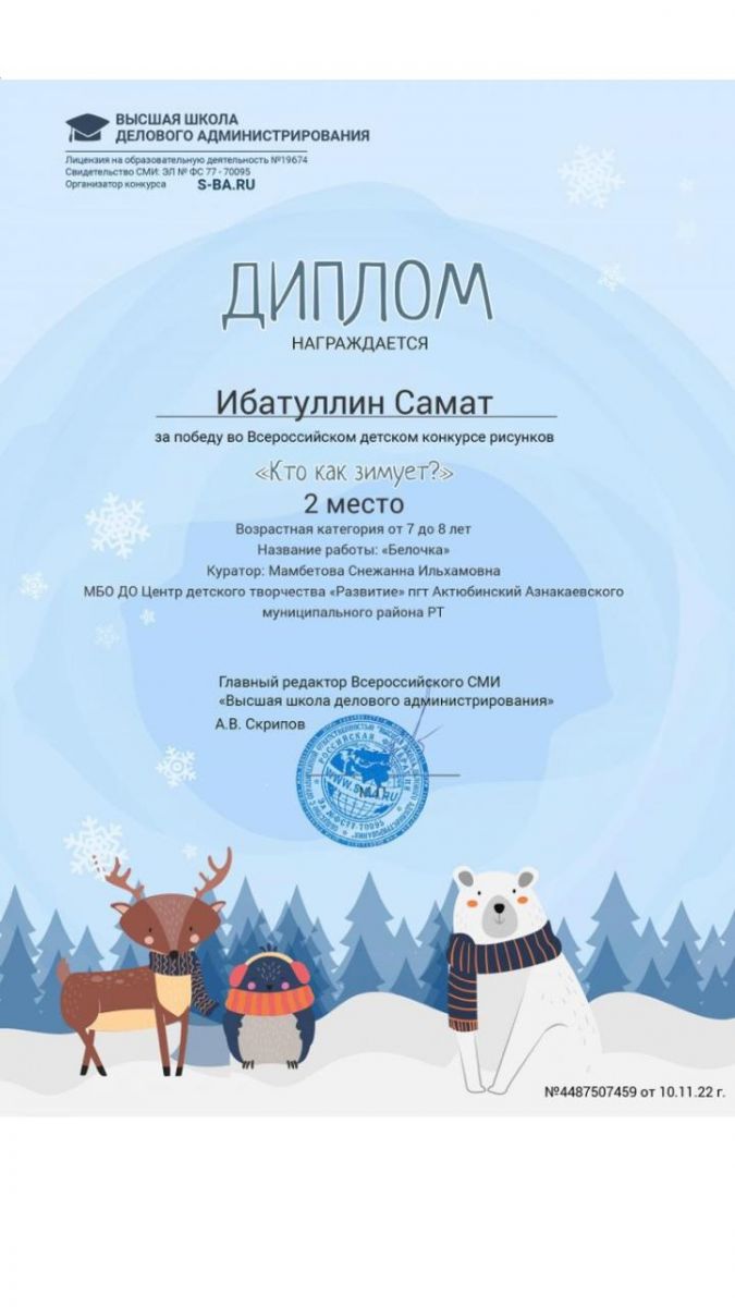 Диплом за 2 место в конкурсе "Кто как зимует", участник Ибатуллин С., педагог Мамбетова С.И.