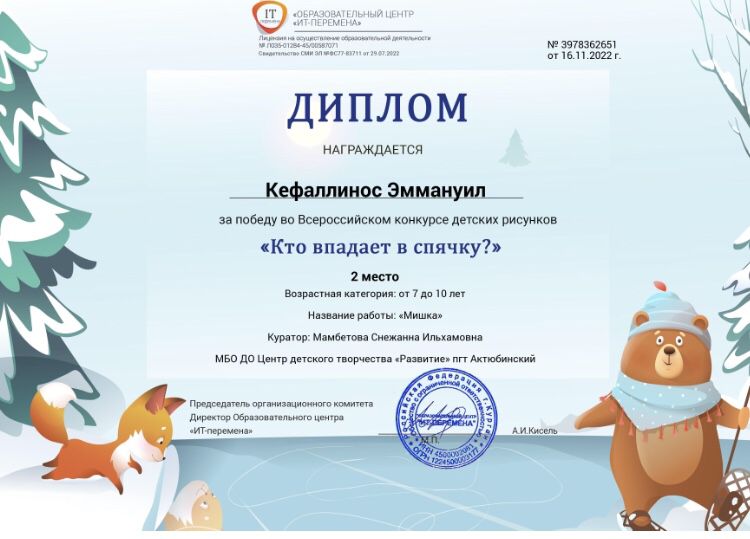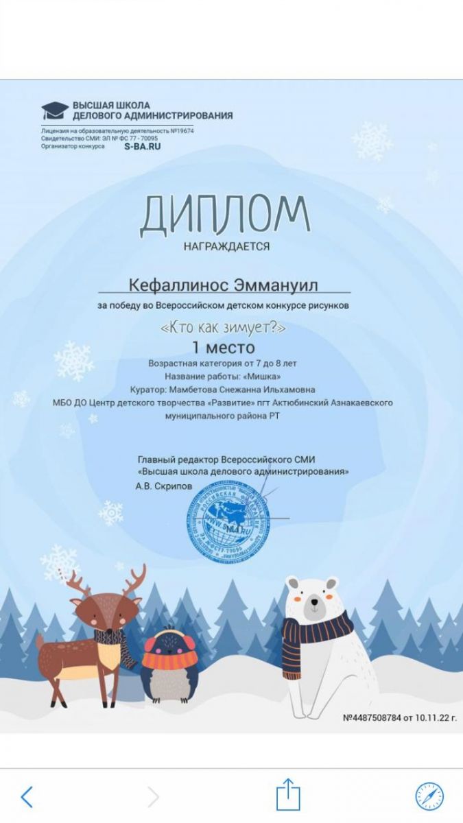 Диплом за 1 место в конкурсе "Кто как зимует", участник Кефаллинос Э., педагог Мамбетова С.И.