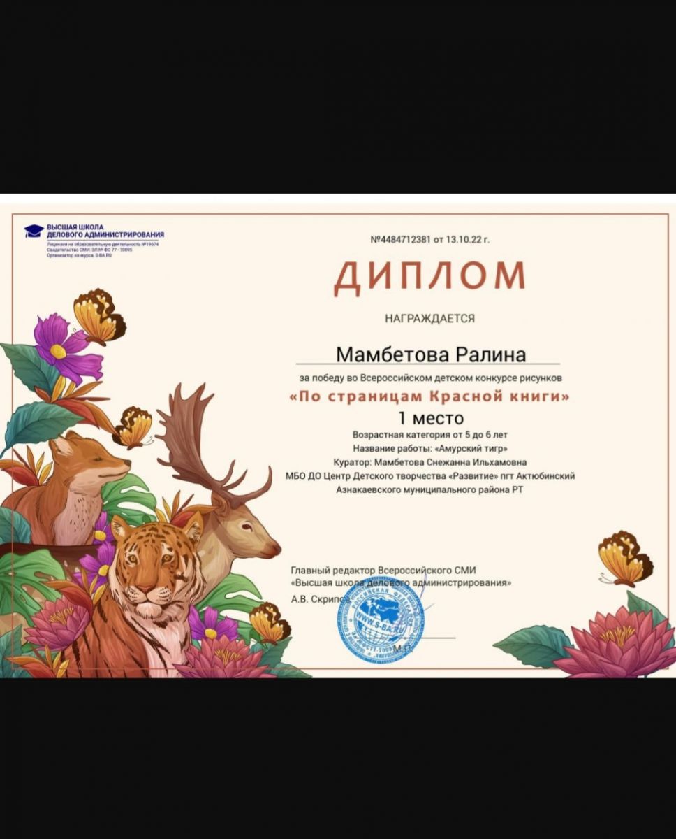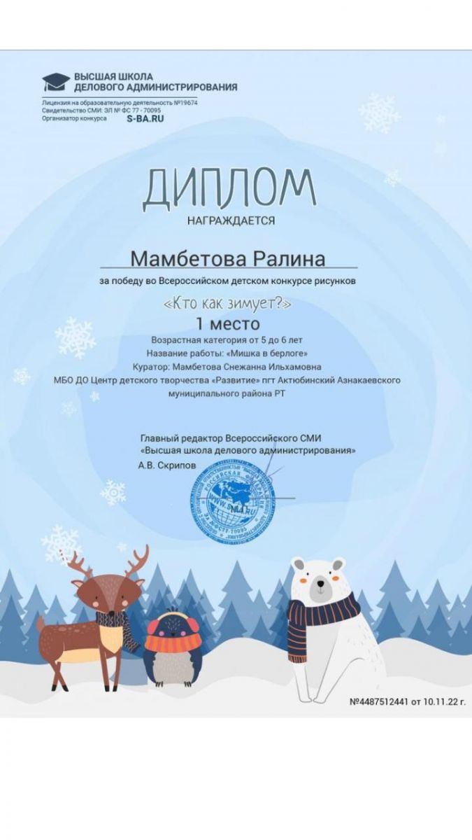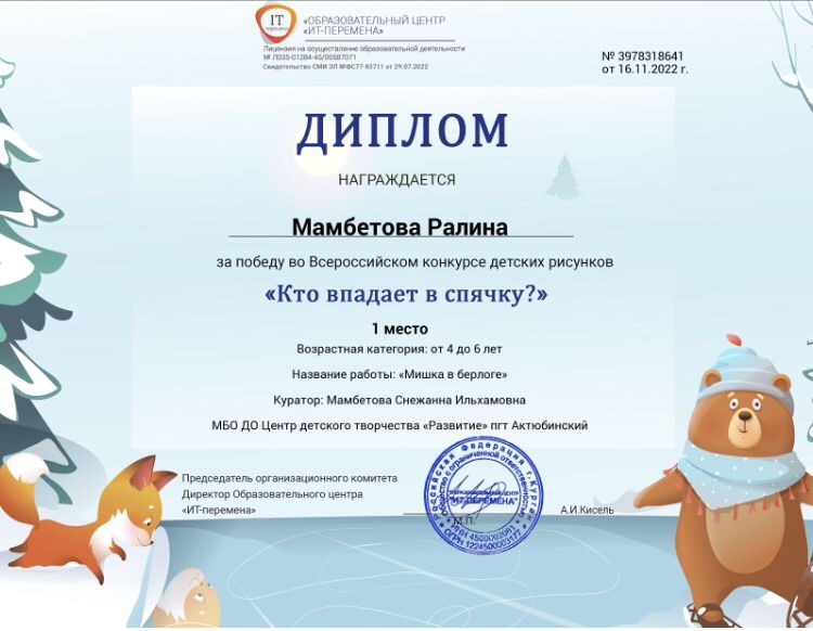 Диплом за 1 место в конкурсе "Кто как зимует", участница Мамбетова Р., педагог Мамбетова С.И.