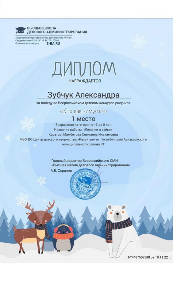 Диплом за 1 место в конкурсе "Кто как зимует", участница Зубчук А., педагог Мамбетова С.И.
