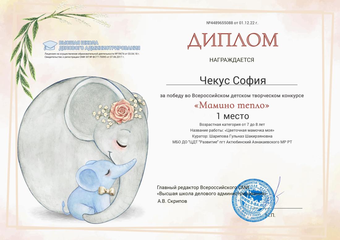 Диплом за 1 место в конкурсе "Мамино тепло", участница Чанышева С., педагог Мамбетова С.И.