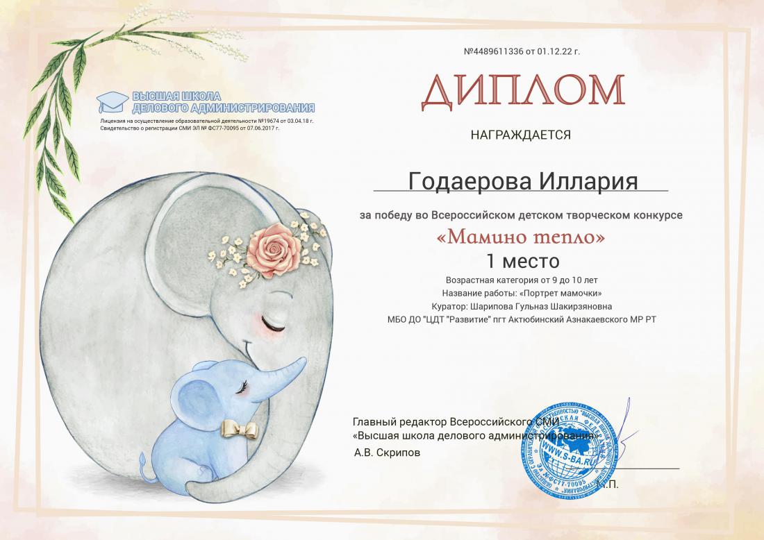 Диплом за 1 место в конкурсе "Мамино тепло", участница Баландина А., педагог Мамбетова С.И.