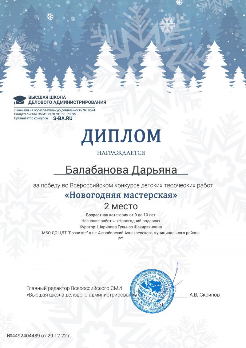Диплом за 1 место в конкурсе "Новогодняя мастерская", участница Цыганова А., педагог Шарипова Г.Ш.