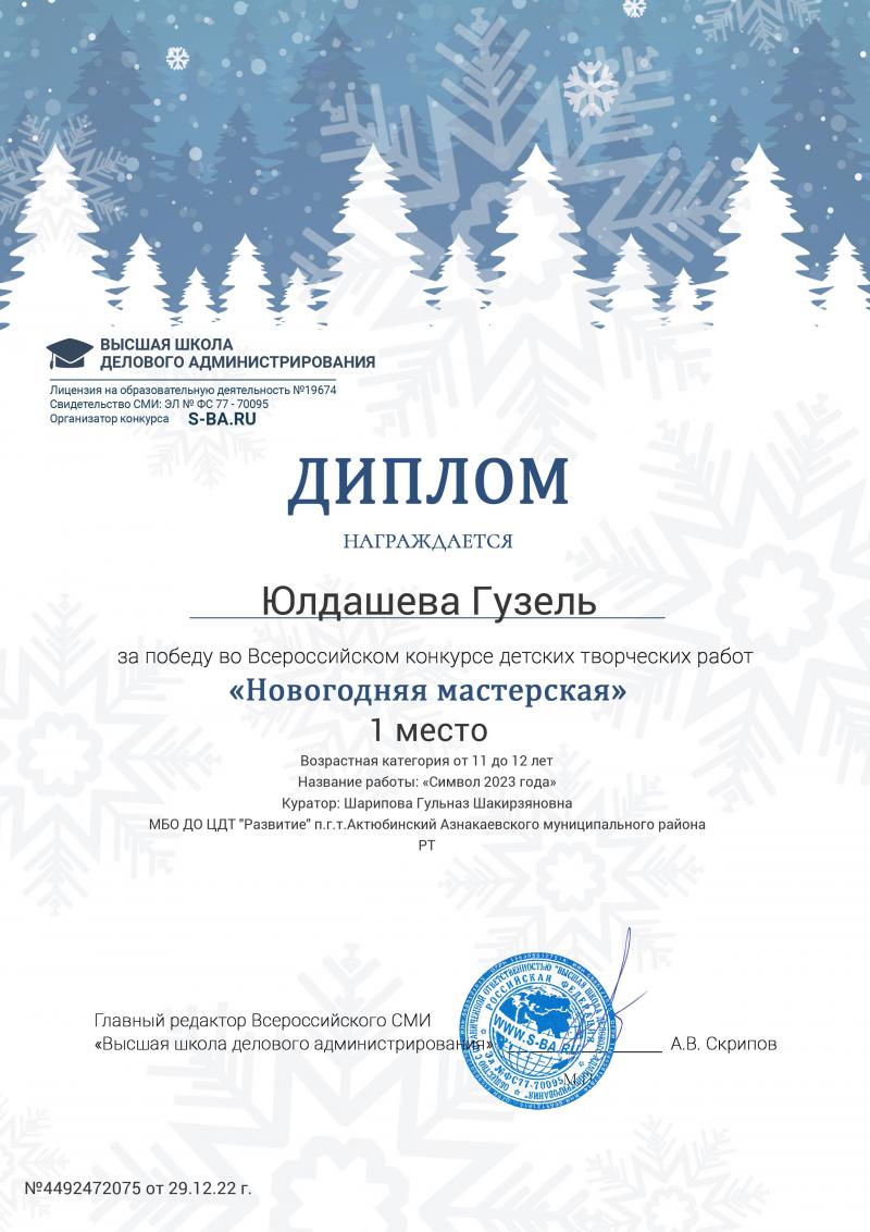 Диплом за 1 место в конкурсе "Новогодняя мастерская", участник Юлдашев Н., педагог Шарипова Г.Ш.