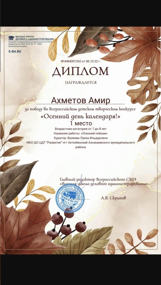 Диплом за 1 место в конкурсе "Осенний день календаря!", участник Ахметов А., педагог Валеева Л.И.
