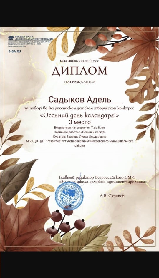 Диплом за 3 место в конкурсе "Осенний день календаря!", участник Садыков А., педагог Валеева Л.И.