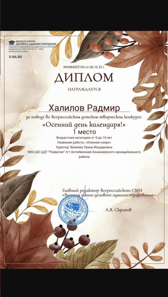 Диплом за 1 место в конкурсе "Осенний день календаря!", участник Халилов Р, педагог Валеева Л.И.