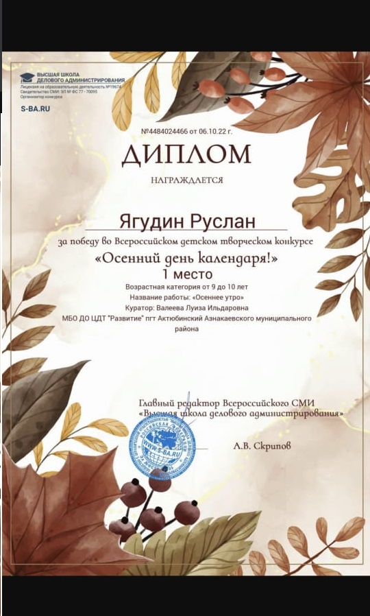 Диплом за 1 место в конкурсе "Осенний день календаря!", участник Ягудин Р., педагог Валеева Л.И.