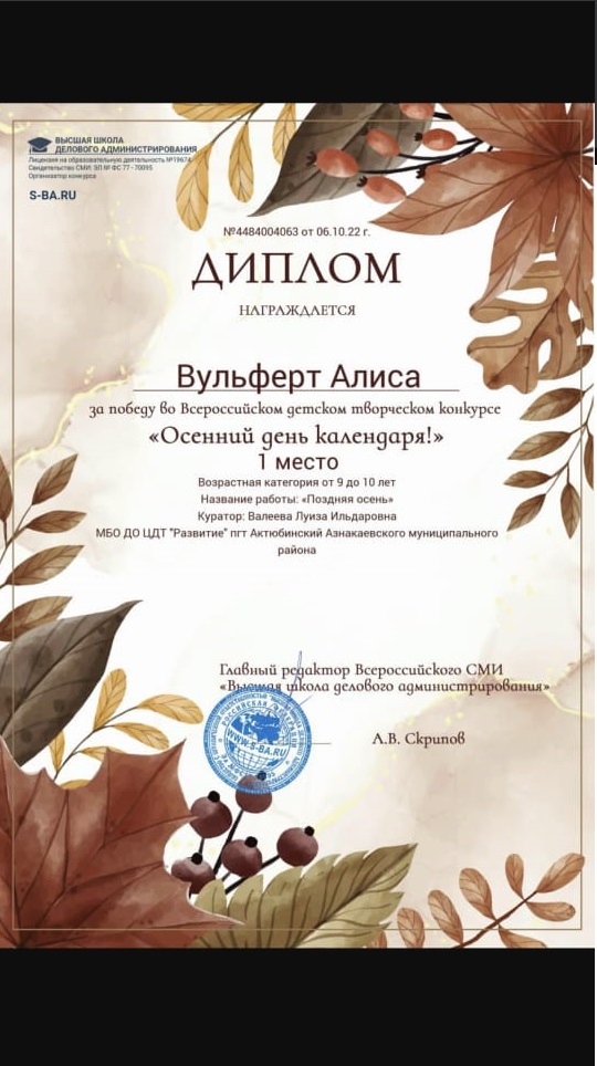 Диплом за 1 место в конкурсе "Осенний день календаря!", участница Вульферт А., педагог Валеева Л.И.