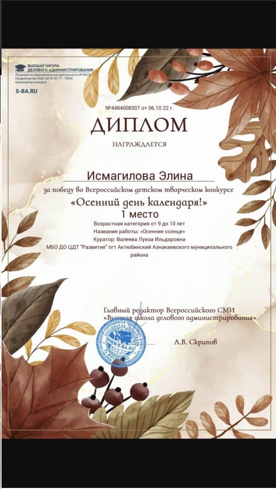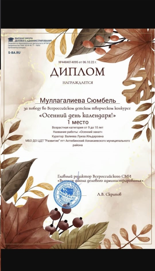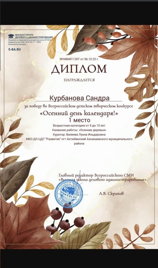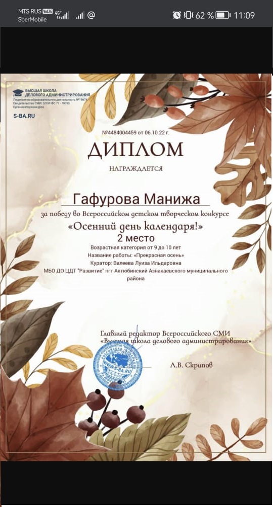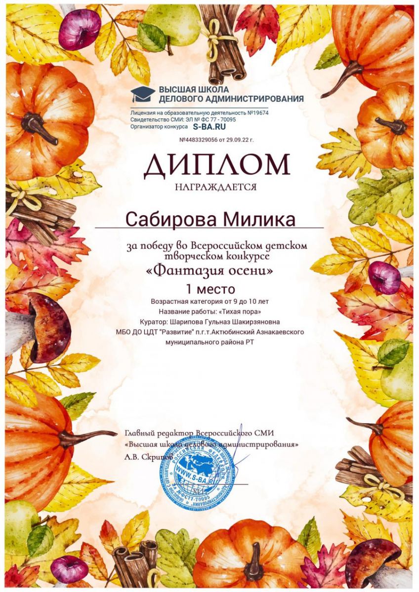 Диплом за 1 место в конкурсе "Фантазия осени", участница Сабирова М., педагог Шарипова Г.Ш.